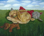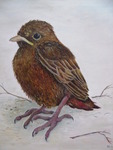 1988Karikatuur van onhandige jonge zangvogel. Net uit het nest, maar niet voor de poes. Grote poten, weke bek, kan nauwelijks opvliegen.